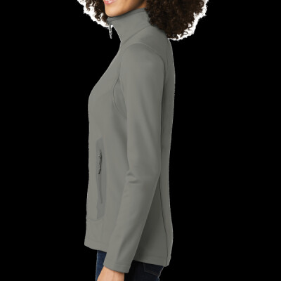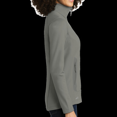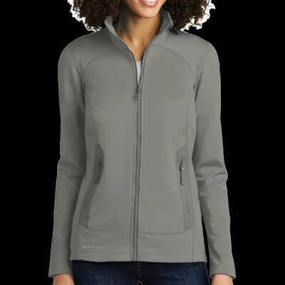 Made for movement, this sophisticated, stretch-infused twill fleece jacket has a smooth face and brushed fleece backing. Tonal welding details at the pockets and streamlined tailoring give it a refined look for indoor and outdoor uses. Beautifully shaped, feminine collar. Molded reverse coil zippers. Front zippered pockets. Contrast Eddie Bauer heat transfer logo on the right hem. Made of 8.3-ounce, 94/6 poly/spandex fleece with an anti-pill finish.